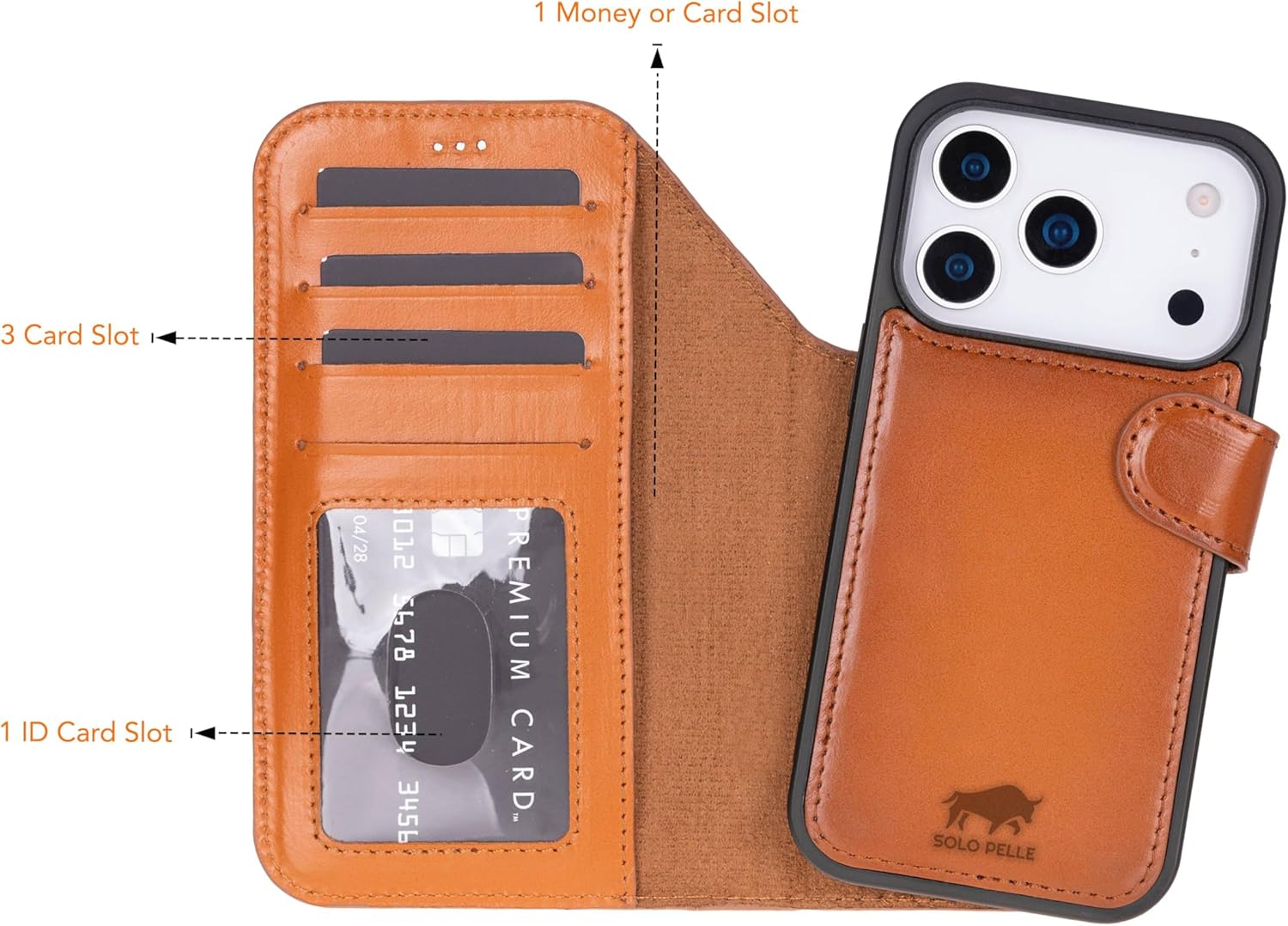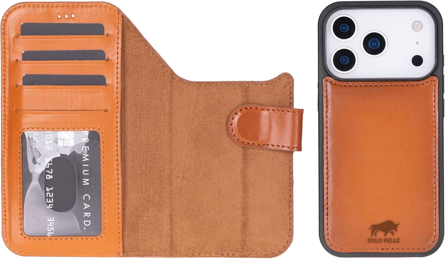 Solo Pelle Cognac Braun Lederhülle kompatibel für iPhone 17 Pro Max in 6.9 Zoll abnehmbare Hülle (2in1) inkl. Kartenfächer geeignet für MagSafe Zubehör